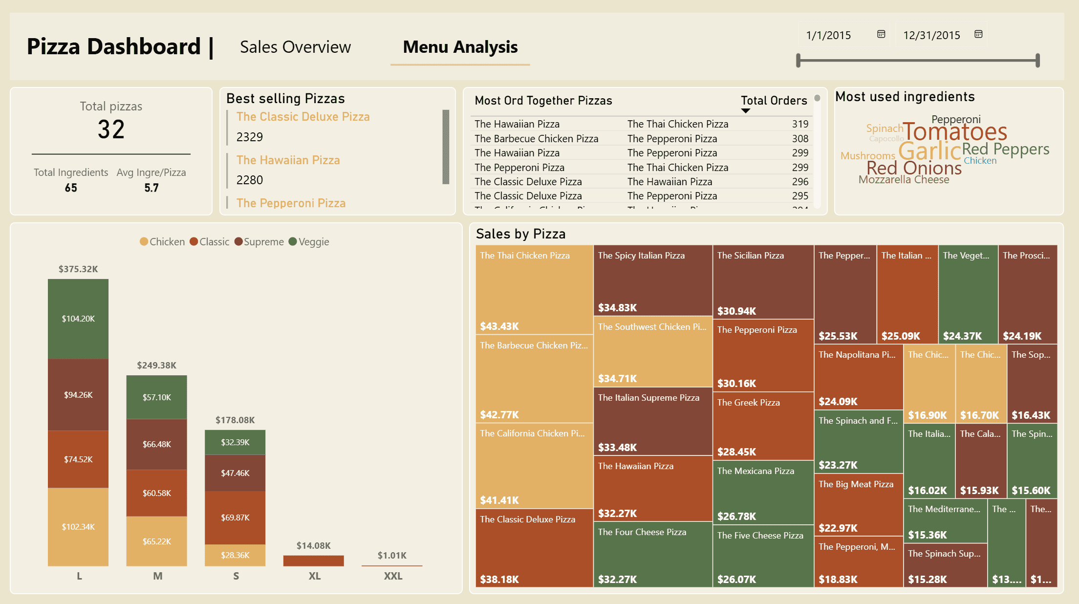 Treemap compares pizzas within categories and ranks revenue contribution. Ingredient usage supports stocking.